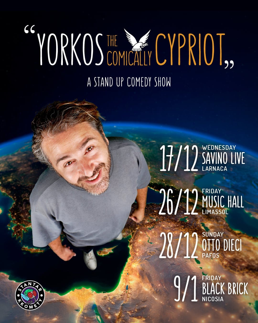 “YORKOS THE COMICALLY CYPRIOT” — A STAND-UP SHOW THAT asks the question "If Cyprus is so small, why is our drama so big? After years of trying to explain Cyprus to the rest of the world (and to Cypriots themselves), comedian Yorkos Kyriakou finally decided to turn national confusion into a comedy tour. His new English-speaking solo show, “Yorkos the Comically Cypriot”, will hit Nicosia, Larnaka, Paphos, and Limassol this December — proving once and for all that being Cypriot is not a nationality... it’s a full-time personality disorder. Yorkos dives into everything from the art of Tsiatista, the lore of the Halloumi, the multiplicity of the Shisto, to the ever-changing socioecomical landscape of Cyprus that forces us to keep up or stay with our moms. “It’s a show about identity,” Yorkos says, “but mostly about why I am proud to be Cypriot but only from a safe distance." The show combines Cypriot absurdity, Mediterranean storytelling, and international-level stand-up, all delivered with Yorkos’ trademark mix of charm, irony, and passive-aggressive patriotism. Whether you’re a Cypriot, an expat, or just someone who’s been yelled at by a Cypriot driver, you’ll finally understand why this tiny island thinks it invented both democracy and halloumi — and is equally responsible for neither