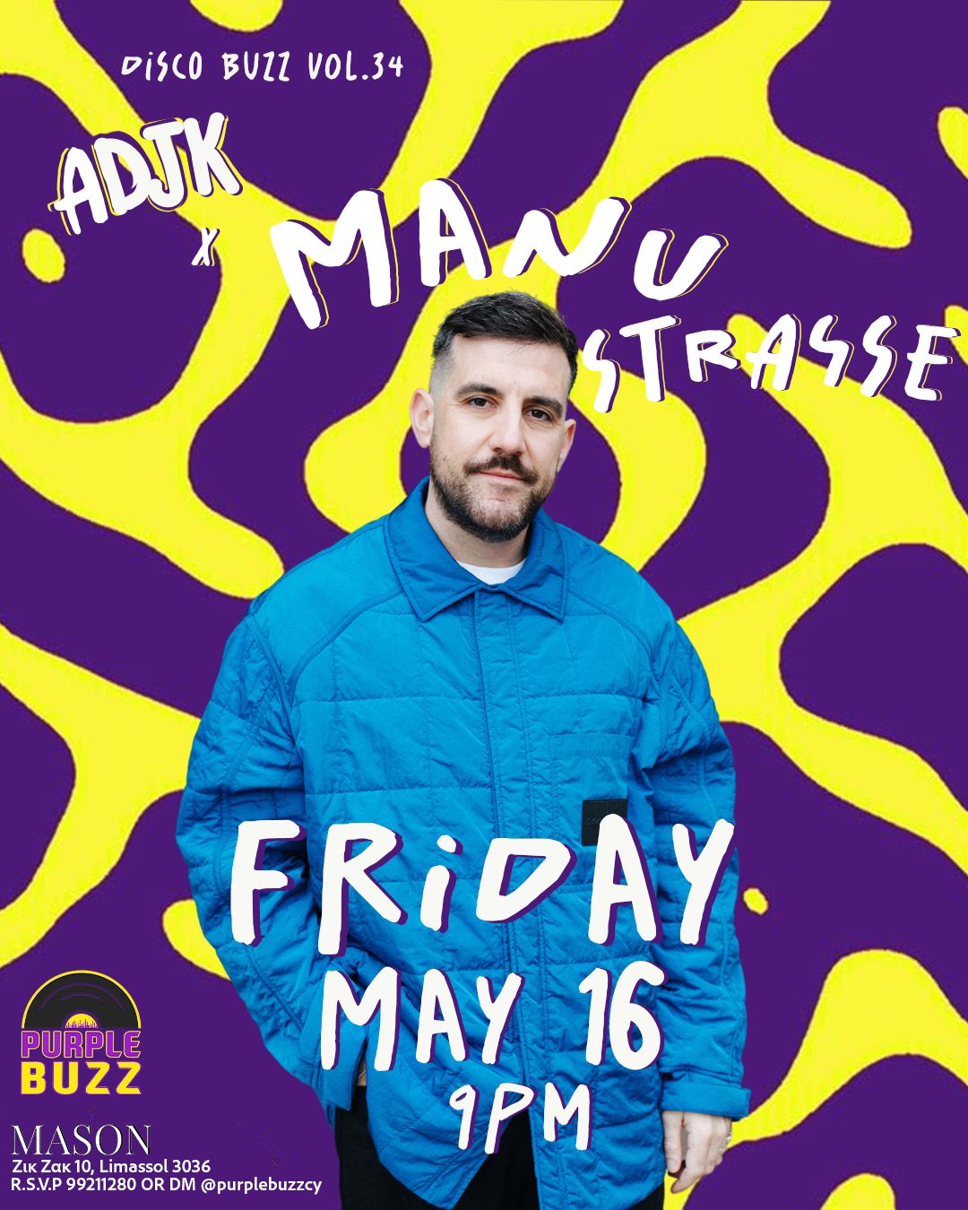Purple Buzz Presents: Disco Buzz Vol.34 w/ Manu Strasse Hailing from Spain and rooted in Berlin’s underground scene, Manu Strasse is bringing his hypnotic grooves and infectious melodies to Cyprus. A resident of Madrid’s iconic Mondo Disko, he has shared the decks with the likes of Dixon, Tale of Us, Adriatique, and more. Get ready for deep, spherical sounds, groovy basslines, and purple beats that will keep you moving all night. Date: Friday, 16th of May Doors open: 20:30 Place: Mason Bar Limassol Supporting act: ADJK Tickets: Early Bird: €10 1st Release: €15 Online Tickets available on RA RSVP: DM @purplebuzzcy on instagram or call 99211280 Go Purple Enjoy The Buzz