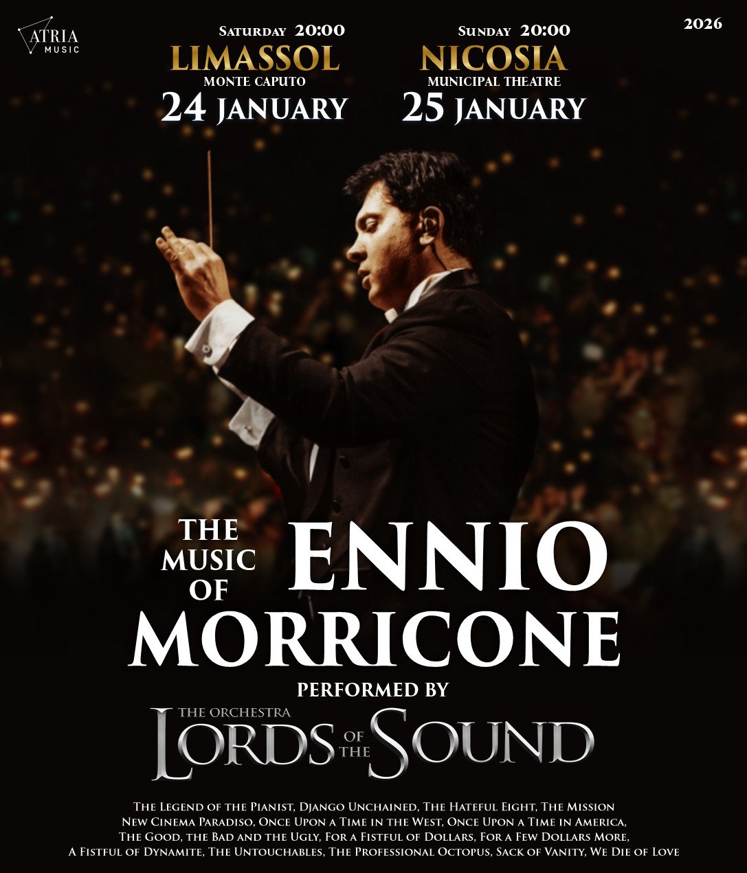 Οι Lords of the Sound είναι μια συμφωνική ορχήστρα διεθνούς φήμης για την εξαιρετική της ικανότητα να μετατρέπει κάθε συναυλία σε ένα συναρπαστικό θέαμα. Ιδρύθηκε πριν από περίπου δέκα χρόνια και έχει φέρει επανάσταση στην ίδια την έννοια της συμφωνικής παράστασης, συνδυάζοντας με μαεστρία την ορχηστρική μουσική με τη γοητευτική σκηνογραφία και τα εντυπωσιακά οπτικά εφέ. Με ένα ρεπερτόριο που περιλαμβάνει τις πιο αγαπημένες μουσικές ταινιών και σύγχρονες κλασικές μελωδίες, οι Lords of the Sound μεταφέρουν στη σκηνή όλη τη δύναμη της έβδομης τέχνης, δημιουργώντας μια καθηλωτική εμπειρία που μαγεύει και συναρπάζει κάθε θεατή. Η ΜΟΥΣΙΚΗ ΤΟΥ ENNIO MORRICONE είναι ένα αφιέρωμα στον αδιαμφισβήτητο ιδιοφυή συνθέτη κινηματογραφικής μουσικής. Οι αξέχαστες μελωδίες από αριστουργήματα όπως Ο Καλός, ο Κακός και ο Άσχημος, Κάποτε στην Αμερική, Η Αποστολή, Cinema Paradiso και πολλά άλλα θα εκτελούνται από μια εξαιρετική συμφωνική ορχήστρα, συνοδευόμενη από εξαιρετικούς σολίστες, ένα σαγηνευτικό φωνητικό σύνολο και ένα εντυπωσιακό οπτικό φόντο που προβάλλεται σε οθόνες LED. Κάθε νότα θα ταξιδέψει το κοινό στις αδιαμφισβήτητες ατμόσφαιρες της μουσικής του Morricone: από την επική πνοή των γουέστερν του Sergio Leone μέχρι την συγκινητική ποίηση των ιταλικών δραμάτων. Η μουσική και οι εικόνες θα συγχωνευθούν σε μια ισχυρή, βαθιά συγκινητική αισθητηριακή εμπειρία που θα ξεσηκώσει τα συναισθήματα και θα αφήσει μια ανεξίτηλη εντύπωση. Αφεθείτε στη γοητεία της ΜΟΥΣΙΚΗΣ ΤΟΥ ENNIO MORRICONE – LORDS OF THE SOUND: μια συναυλία που γιορτάζει την τέχνη, το συναίσθημα και τη διαχρονική δύναμη της μουσικής. Ένα αδιαμφισβήτητο γεγονός για όλους τους λάτρεις του κινηματογράφου και της μεγάλης συμφωνικής μουσικής.