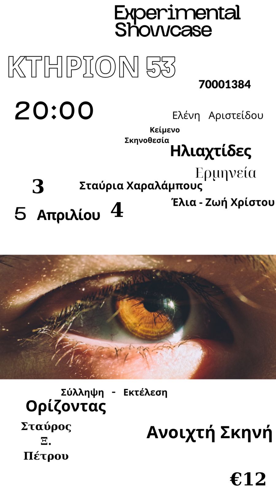 Experimental Showcase Από την Ανοιχτή Σκηνή στο ΚΤΗΡΙΟΝ 53. ΟΡΙΖΟΝΤΑΣ Σύλληψη - Εκτέλεση: Σταύρος Ξ. Πέτρου Ορίζοντας: μετοχή ενεργητικού ενεστώτα του ρήματος ορίζω ή ένα νέο performance art που σχηματίζει τον ορίζοντα Λευκωσία - Μιλάνο - Λευκωσία και συνεχίζει να ερευνά καλλιτεχνικά το πιο αλλόκοτο αλλά και καθημερινό υλικό που χρησιμοποιούμε όλοι! ΗΛΙΑΧΤΙΔΕΣ Κείμενο - Σκηνοθεσία: Ελένη Αριστείδου Ερμηνεία: Σταύρια Χαραλάμπους, Έλια Χρίστου Όπου υπάρχουν ηλιαχτίδες, δε θα ακολουθήσει και ο ήλιος σε κάποια στιγμή; Ένα μονόπρακτο θεατρικό έργο για το χάος της ζωής μετά την αποφοίτηση, για το φόβο πως δε θα βρεις ποτέ το δρόμο για τον οποίο ήσουν τόσο σίγουρος στα 22, και για το πως να βρεις τον ήλιο μέσα από τα σύννεφα. Προειδοποίηση: Το κείμενο περιέχει αναφορές σε αυτοκτονικές σκέψεις. 3, 4, 5 Απριλίου, στις 20:00 Γενική είσοδος: €12 Πληροφορίες: 70001384 Pre-event στις 18:00. Στον χώρο θα σερβίρονται οινοπνευματώδη ποτά.