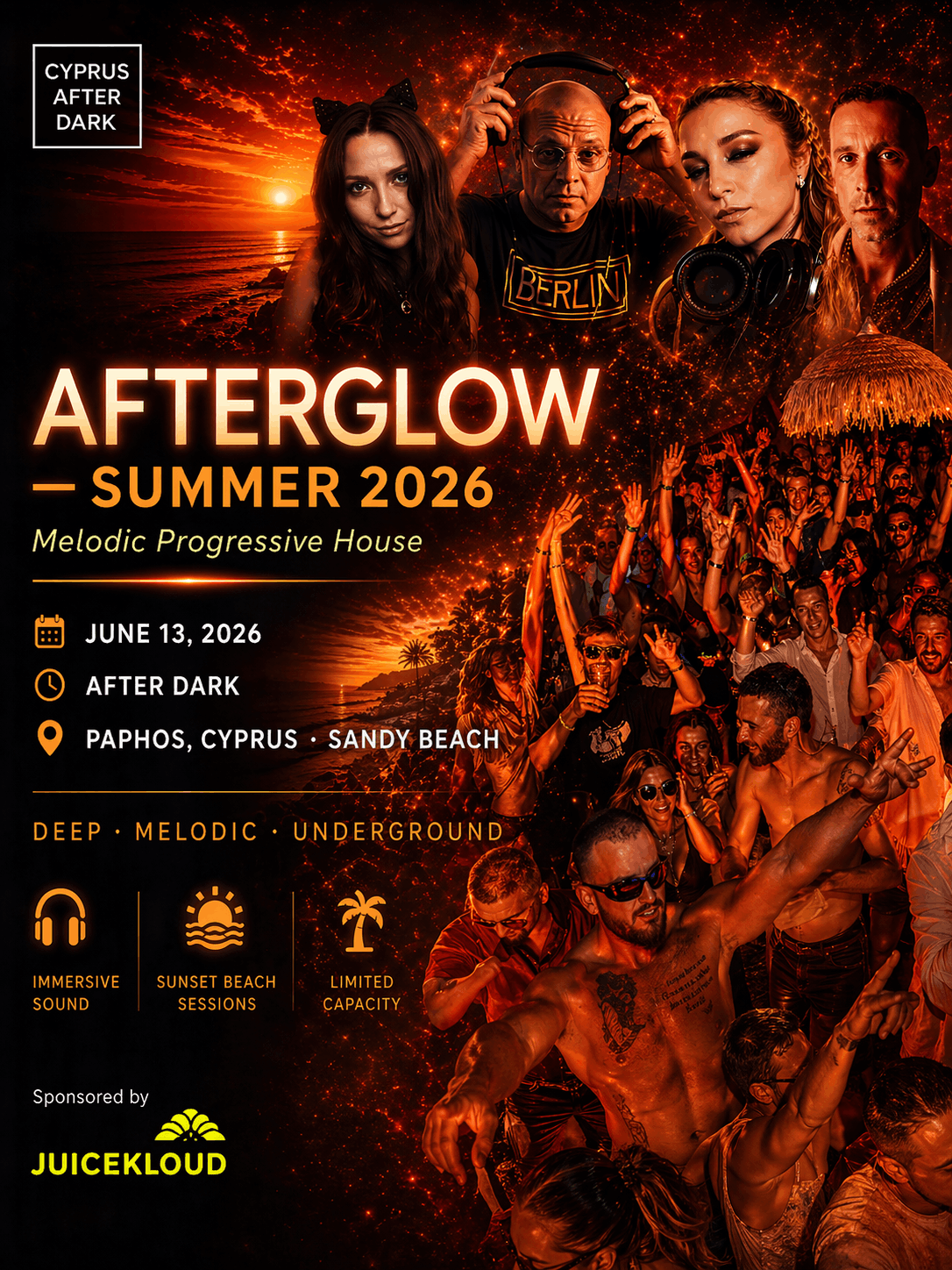AfterGlow is an open-air melodic progressive house experience by Cyprus After Dark, set on the coastline of Sandy Beach, Paphos.